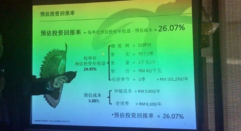 除了房产项目还有金阳庄的榴莲投资项目,榴莲不仅能吃还能投资,且投资回报率竟高达26.07%。